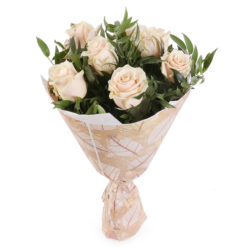 Букет состоит из 9 кремовых роз, зелень, крафт, бежевая лента.
