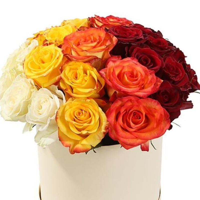 Букет состоит из 25 белых / желтых / оранжевых и красных роз, шляпная коробка.