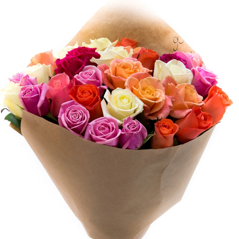 Букет состоит из MIX из 35 роз, крафт, атласная лента.