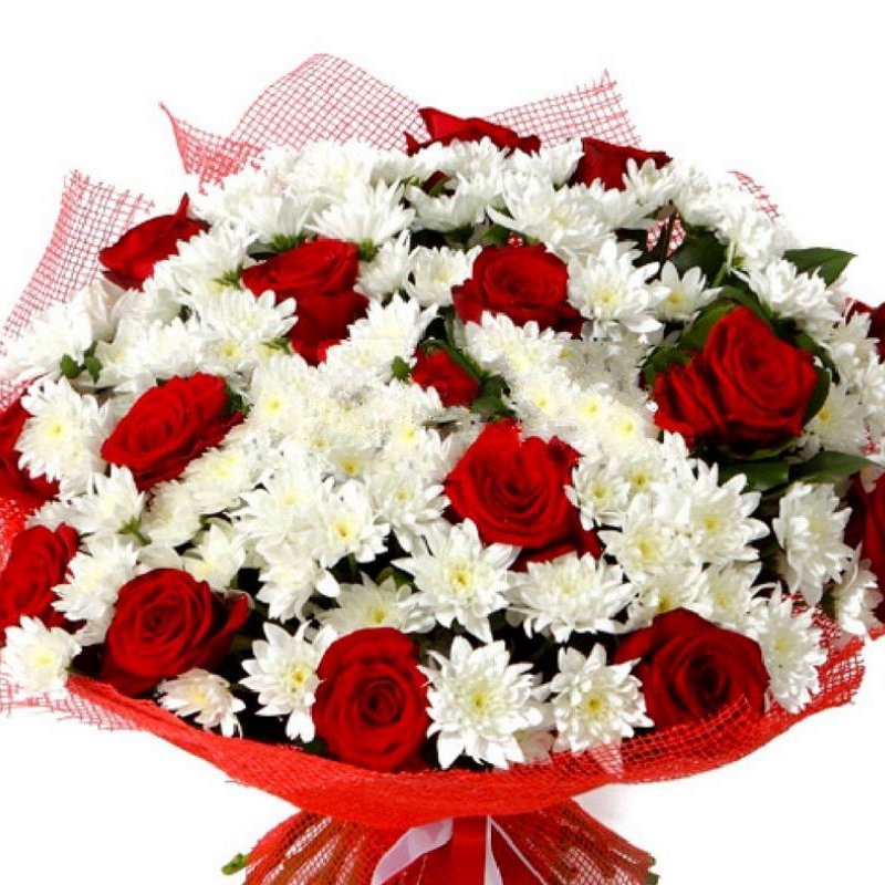 Букет состоит из 17 красных роз, 15 веток белой хризантемы, красивая упаковка.