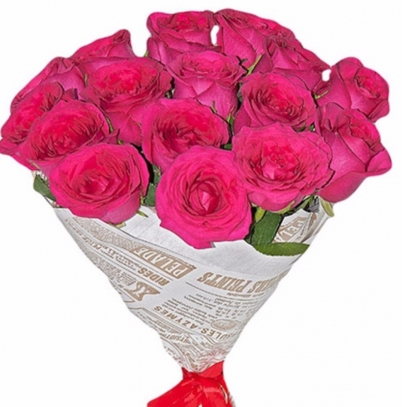 Букет состоит из 15 малиновых роз, крафт, атласная лента.