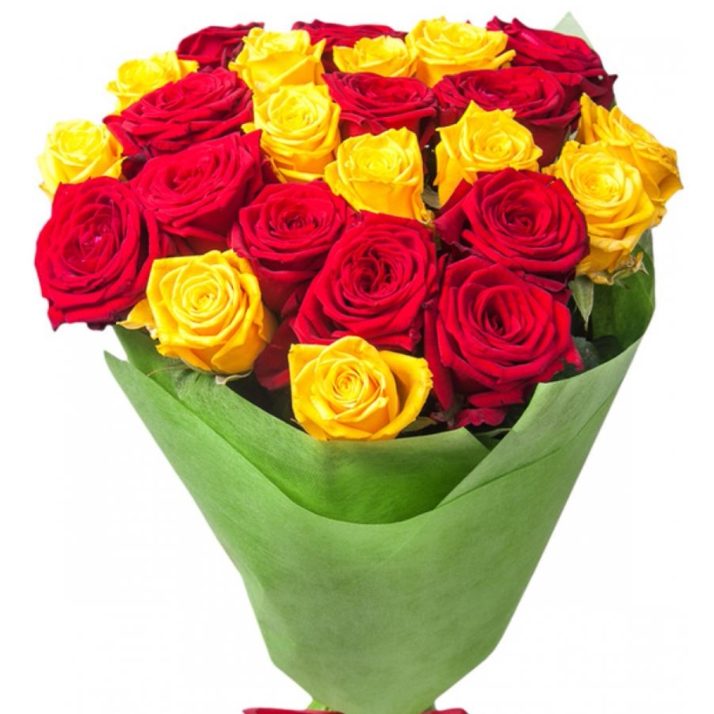 Букет состоит из 23 красные розы, 22 желтые розы, красивая упаковка, атласная лента.