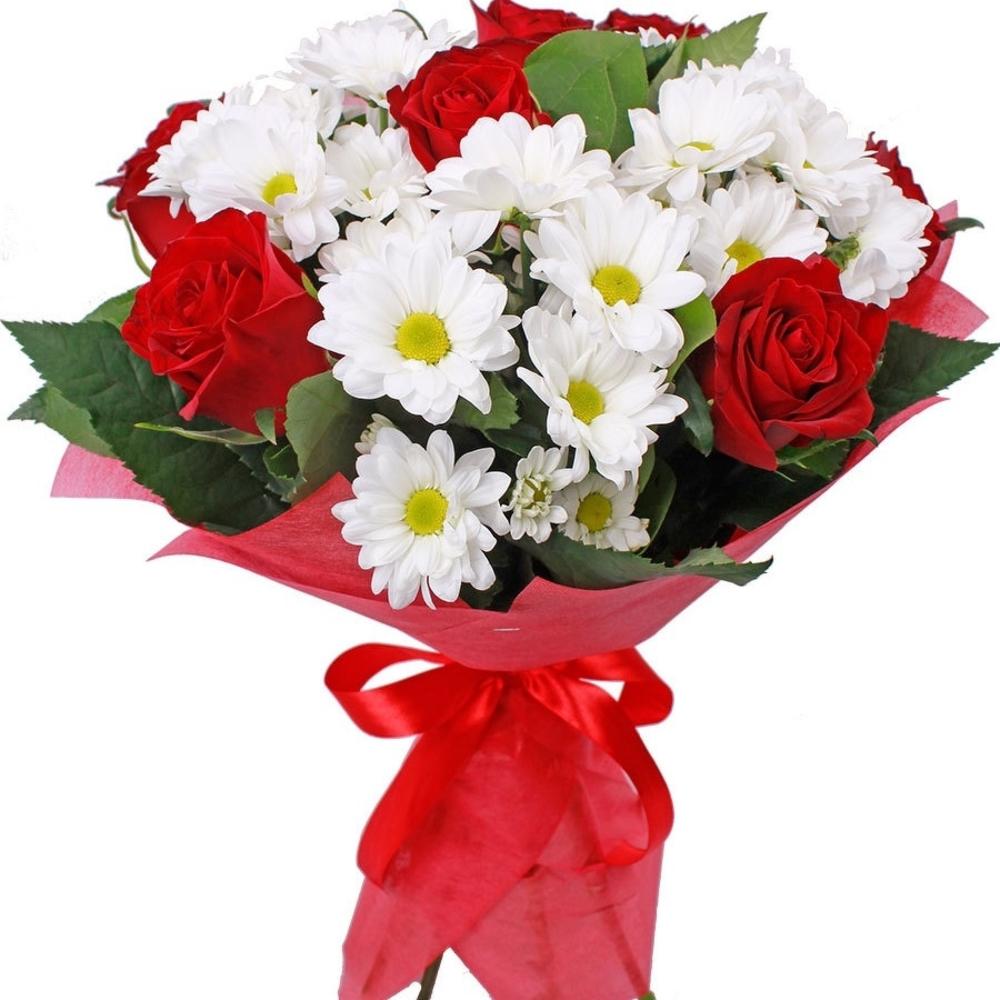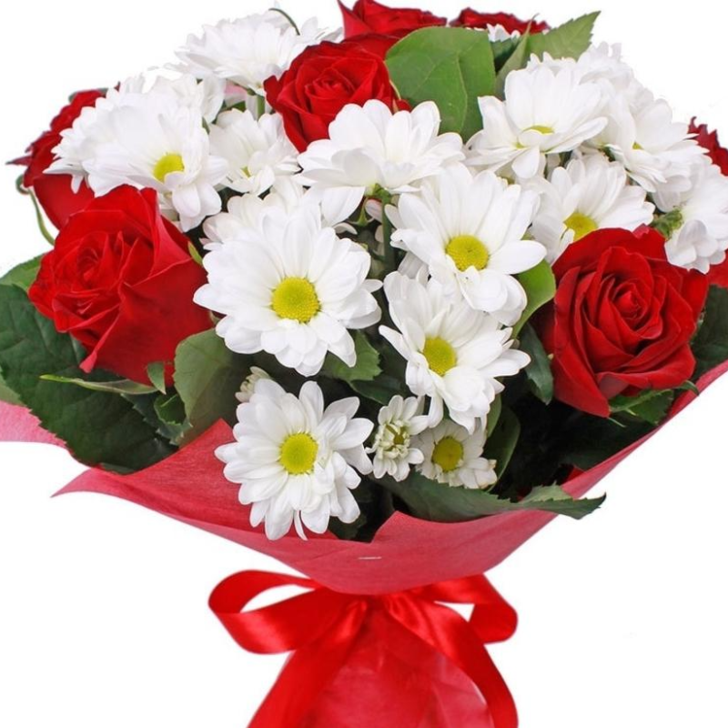 Букет состоит из 7 красных роз, 5 веток белой хризантемы, красивая упаковка, атласная лента.