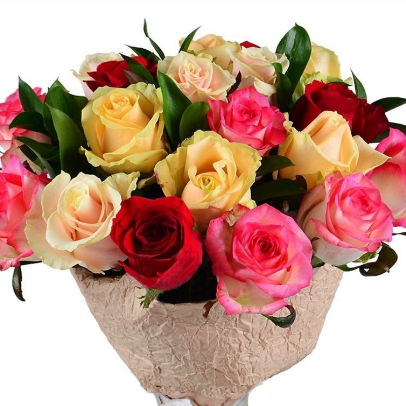 Букет состоит из MIX из 19 роз, зелень, крафт, атласная лента.
