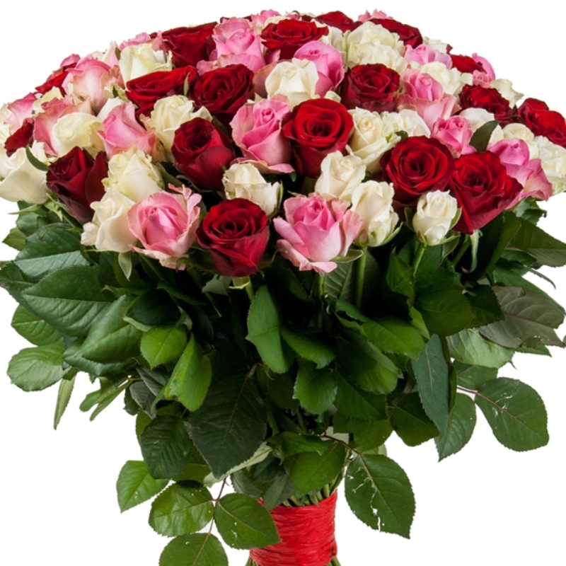 Букет состоит из 17 белых роз, 17 красных роз, 17 розовых роз, прозрачная упаковка, атласная лента.
