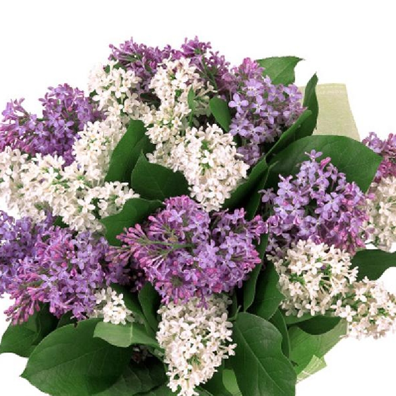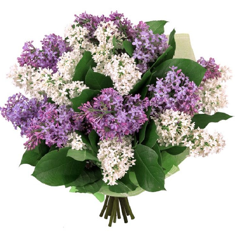 Букет состоит из 15 веток сирени, прозрачная упаковка, атласная лента.