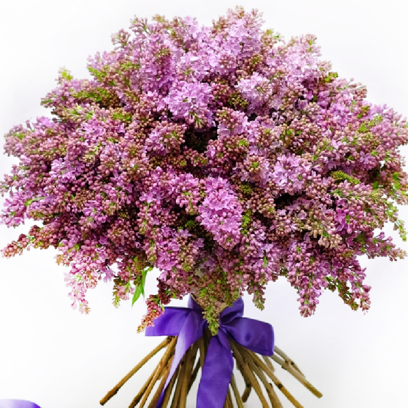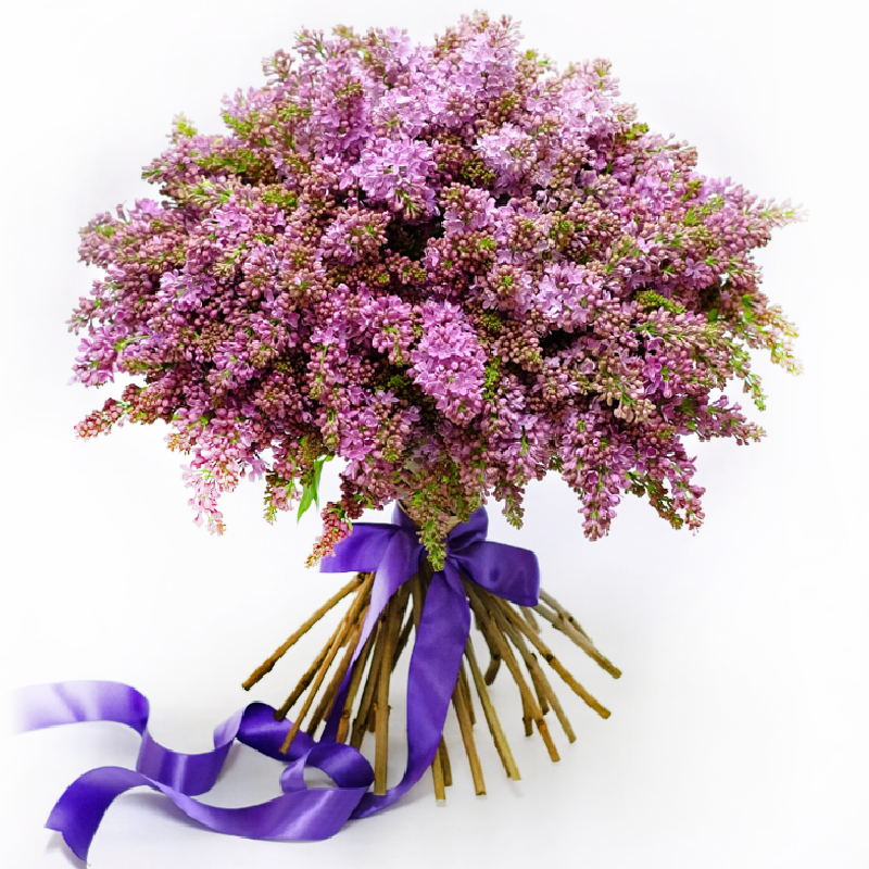 Букет состоит из 25 веток сирени, прозрачная упаковка, атласная лента.