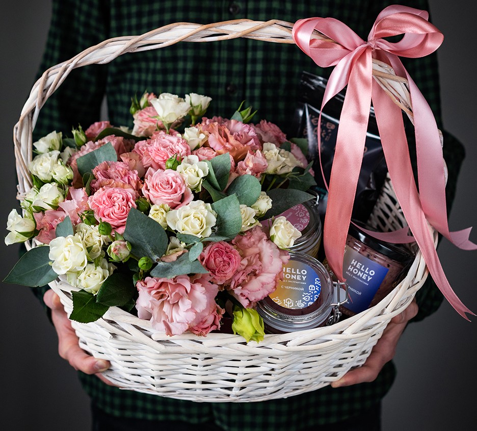 В набор входит: натуральный мёд, крем-мёд, домашнее варенье и пакет травяного чая. Мы поможем составить идеальное сочетание, которое подойдёт для вашего случая.Настоящее украшение корзины — букет живых цветов. В композицию входят пионовидные розы «Мисс Бомбастик», белые кустовые розы «Сноуфлейк», эустома и эвкалипт.
