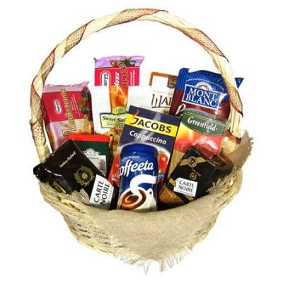 Корзина с чаем, кофе и сладостями.